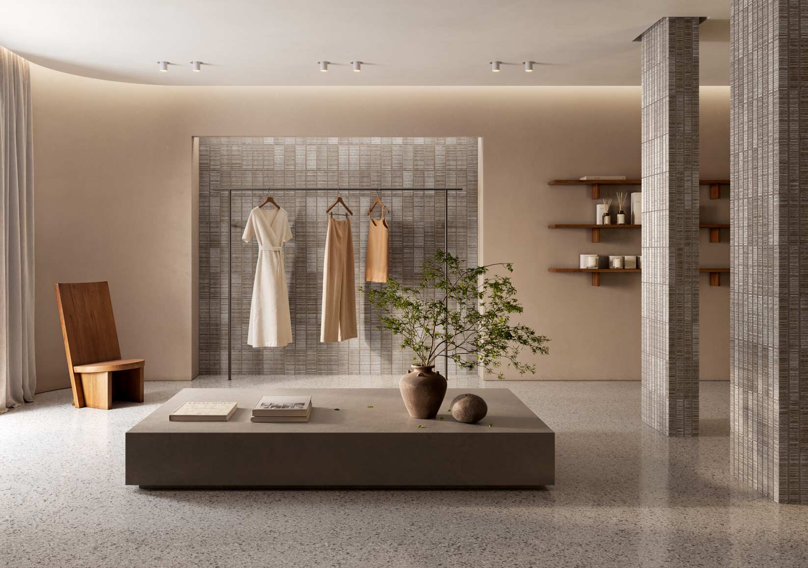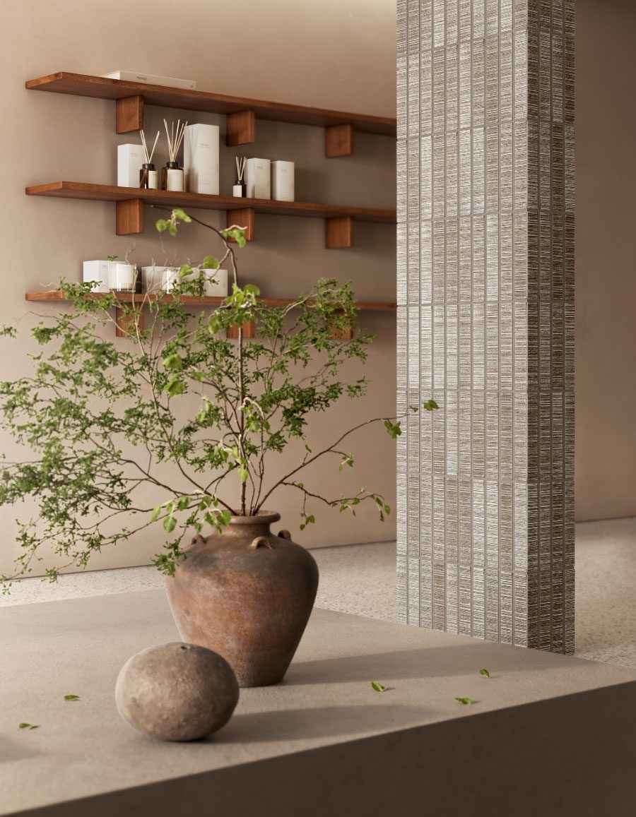 La variante Drifted si presenta come una superficie più distesa, priva di incisioni, in cui la materia emerge attraverso una finitura irregolare e profondamente artigianale, pensata come momento di pausa e respiro all’interno del sistema.